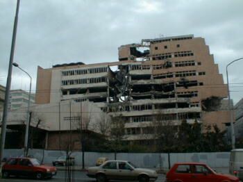 Turning off toward the Sava Center, we had our first real encounter with the war’s scars: the bombed-out headquarters of the Socialist Party. All the windows were gone, yet unlike New York’s Twin Towers, the building still stood—barely. We made our way into the city center, deciphering street signs written entirely in Cyrillic.